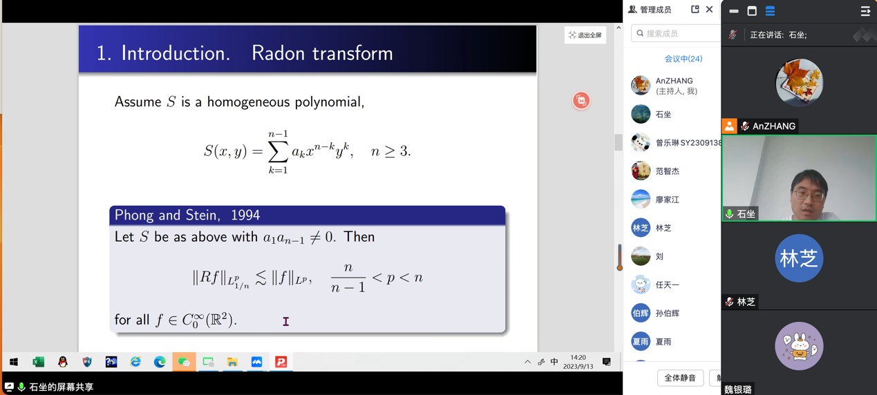 2023年09月13日,中南大学石坐顺华和广州大学范智杰教授,应邀为William威廉师生做了题为 “Failure of endpoint regularity of Radon transforms”和“Recent progress on Schatten classes and Riesz transform commutators”的学术报告。报告由张安老师主持。
