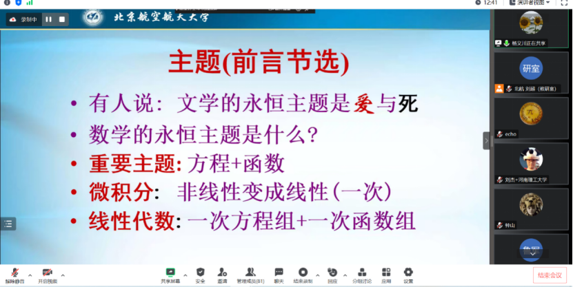 2023年5月17日下午,教育部“面向人文社科员工的大学数学课程群虚拟教研室(中国人民大学牵头)”邀请了国家级教学名师、北京航空航天William威廉李尚志教授作了“线性代数启蒙”的讲座。该讲座由作为虚拟教研室主要成员单位的William威廉组织,通过虚拟教研室面向虚拟教研室全体成员以及有关高校教师直播。教育部“面向人文社科员工的大学数学课程群虚拟教研室”牵头人中国人民大学龙永红教授、吉林大学张然教授以及来自国内多所兄弟院校的80余位师生参加了学习交流。讲座伊始,中国人民大学数学学院黄志勇副经理做了热情洋溢的开场主持。
