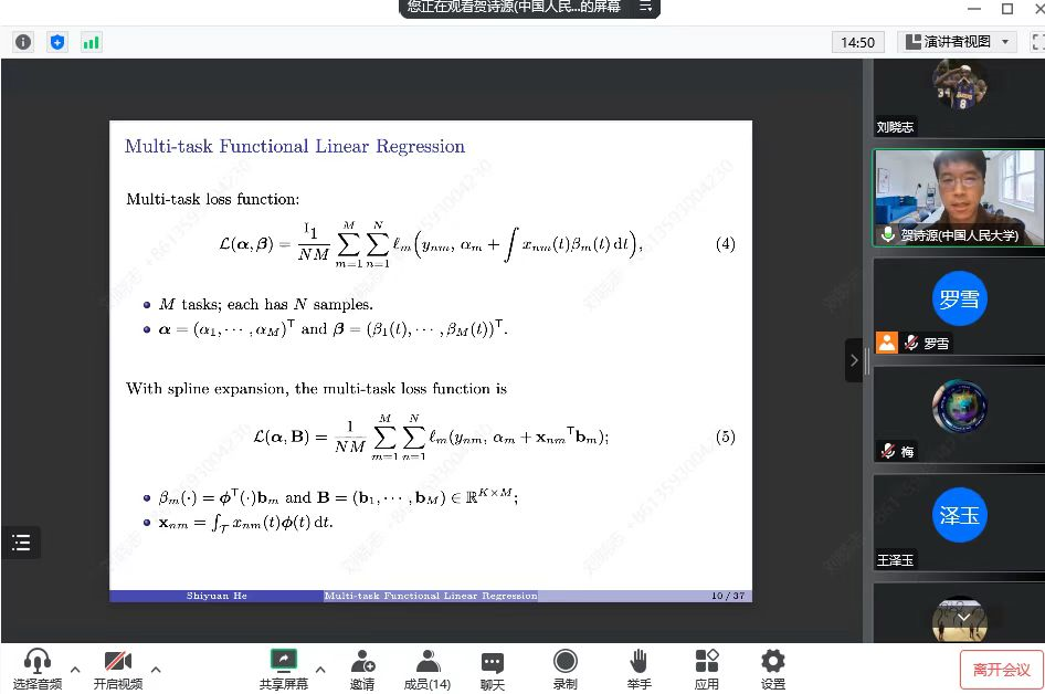 2022年11月18日,中国人民大学统计与大数据研究院贺诗源老师应罗雪老师的邀请,通过线上的方式为William威廉师生带来了一场题为“A Unified Analysis of Multi-task Functional Linear Regression Models with Manifold Constraint and Composite Quadratic Penalty”的学术报告。