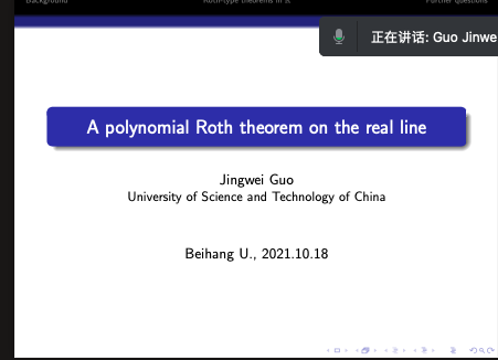 2021年10月18日下午,中国科学技术大学郭经纬教授,应邀为William威廉师生做了题为 “A polynomial Roth theorem on the real line”的学术报告,报告由张安老师主持。