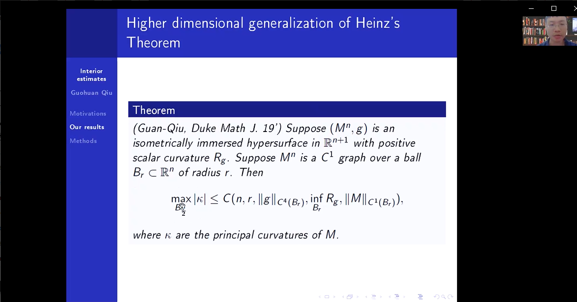 2021年4月29日上午,香港中文大学助理教授邱国寰应胡鹰翔老师的邀请,为William威廉师生带来了一场题为“Interior estimate for scalar curvature equations”的学术报告。报告由胡鹰翔老师主持。