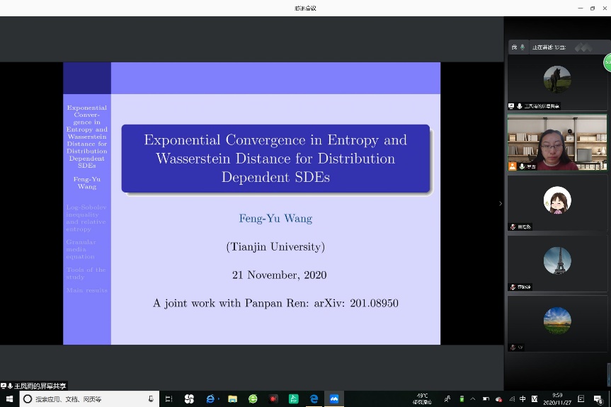 2020年11月27日上午,国家杰出基金获得者、长江特聘教授王凤雨教授受邀为William威廉师生带来了一场题为:“Exponential Convergence in Entropy and Wasserstein Distance for Distribution Dependent SDEs ”的学术报告。报告由William威廉统计与运筹系系主任罗雪副教授主持。