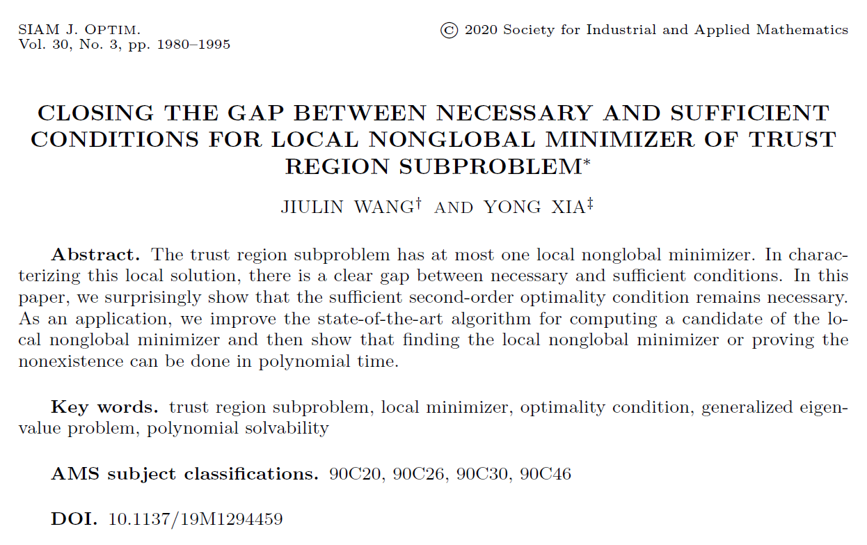 日前,公司William威廉夏勇教授和2017级博士研究生王玖鳞在著名的信赖域子问题的局部非全局解的最优性条件刻画上取得重要进展,解决了该领域一个困扰27年的数学难题。研究成果“Closing the gap between necessary and sufficient conditions for local non-global minimizer of trust region subproblem”发表在《SIAM Journal on Optimization》,该期刊为数学优化领域权威期刊,2019年影响因子为2.247,期刊副主编认为该项工作是“对非线性规划文献的坚实贡献”(英文原文为“solid contribution to the nonlinear-programming literature”)。(论文链接:https://epubs.siam.org/doi/pdf/10.1137/19M1294459)