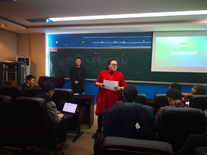 2018年11月9日,数学与系统科学学院本科生在主楼321教室进行了2018年优良学风班答辩,出席本次答辩会的有学院2016级各小班答辩代表和部分员工,公司党委副书记丁丁老师、班主任代表郑孝信老师、教务秘书曹安妮老师、2015级辅导员张孝涛和2016级辅导员刘禹吟担任评委。本次答辩会由1609大班宣传委员刘晋玮同学主持。