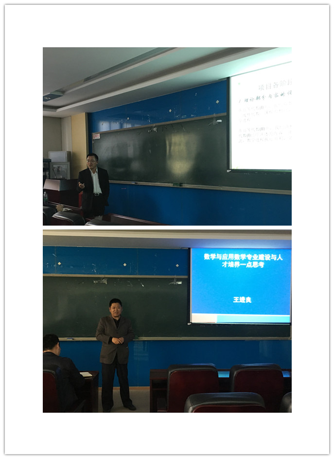 公司王进良教授做了“数学与应用数学专业建设与本科人才培养的思考”的报告。王进良教授从专业方向、团队力量、研究方向和对本科生的调研实际出发,从主观和客观两方面分析了存在的问题,建议科研优势与人才培养相结合、知名教授和青年专家为本科生授课、重视导师制与班主任的作用、推广高年级研讨班、加强数学文化与对师生的人文关怀。