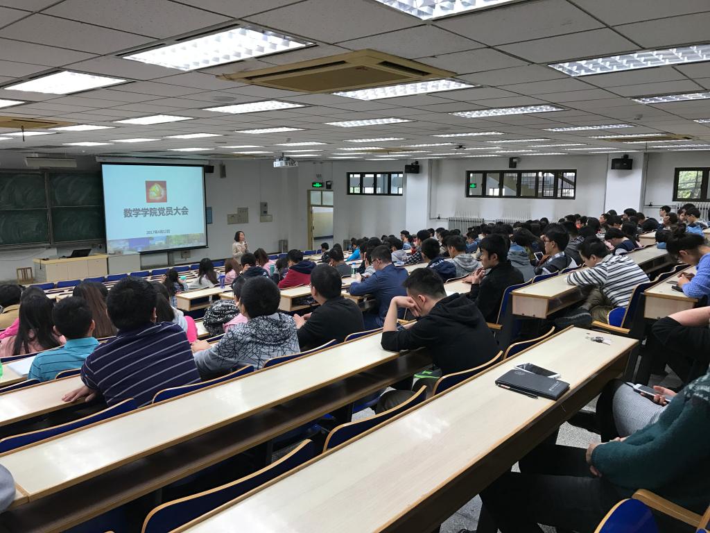 4月12日中午,数学与系统科学学院在主M101召开党员大会,全院近两百名党员参加了会议。党委书记李红捷向全体党员传达了学校2017年全面从严治党工作会议以及全公司党支部书记大会两个会议的精神,与全体党员集体学习了张军书记在大会上的讲话。