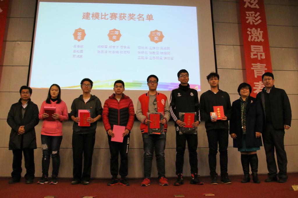 数学学院教师郭炳晖对本次建模比赛中“中医医疗”、“基因突变”和“互联网金融”的三个前沿题目进行了全面分析,精彩的点评让大家对数学建模思想更多了几分理解与思考。随后,郭炳晖老师宣读了本次建模比赛获奖名单,教务处副处长曹庆华、数学学院教师李美生为获奖同学颁发了证书。