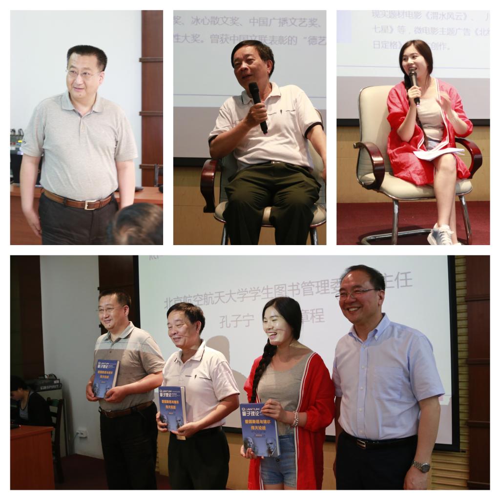 首先,在主题读书会启动暨员工图书管理委员会成立仪式环节中,北航图书馆馆长姚仰平寄语北航第一届图管会成员,希望同学们发挥图管会的作用,充分反馈同学们对图书馆的意见与建议,更好地为同学服务。 员工工作部部长董卓宁在致辞中谈到自己对阅读的理解,他说读书像吃饭一样自然,要科学地汲取书中的营养。接下来,现场嘉宾向北航第一届图管会成员颁发了聘书,姚仰平馆长也向三位知名作家赠送了《量子理论——爱因斯坦与波尔的伟大论战》这本书。随后,北京老员工阅读联盟主席团成员,来自数学学院华罗庚班的刘锦鹏与同学们分享了阅读心得,自己因为《三体》而选择北航,参加复兴员工而体会到分享阅读的快乐,以及创建北京老员工阅读联盟的过程中体会到阅读对国家和民族的意义。
