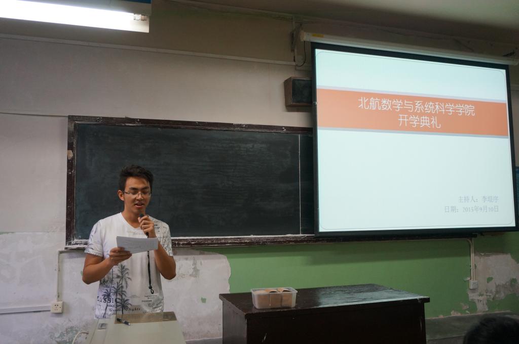 李红捷书记首先发表讲话,代表数学学院对全体新生表示欢迎,并叮嘱大家在认真科研学术的同时注意培养情、培养爱,不仅在学术上有所突破,也能在生活上健康的成长。随后,佘志坤副经理对学院学科体系、实验室设备配置和团队力量等六个方面做了详细介绍,并对硕博招生及毕业新标准做了详细解读,鼓励大家严格要求自我,在学术领域有所突破,佘经理还突出强调了学校、学院推动国际化建设政策,并列举了公司签署的几个国际化培养项目,鼓励大家走出国门,拓宽视野。紧接着,王菲老师为大家介绍了公司员工工作的相关情况,对学籍管理及奖学金评定进行了耐心细致的说明,并从方便同学日后工作、生活角度给大家具体说明了几个重要问题,鼓励大家在学习、科研、生活上积极主动,融入新的环境,创造新成果。教务秘书谭青祥老师对研究生课程计划及培养规定给同学们做了详细介绍和强调,并针对开学伊始同学们要做的事情一一提醒,着重强调了研究生期间处理好导学关系的重要性。最后,研究生辅导员李垠序分享了自己研究生生活、学习和科研的经验,希望同学们能多反省自己,处理好与老师的关系;研究生辅导员李田田,分享了自己在北航本科4年来的感受与想法,表达了“成为同学们遇到困难时能想到的人”的工作目标。2015级研究生开学典礼圆满结束。