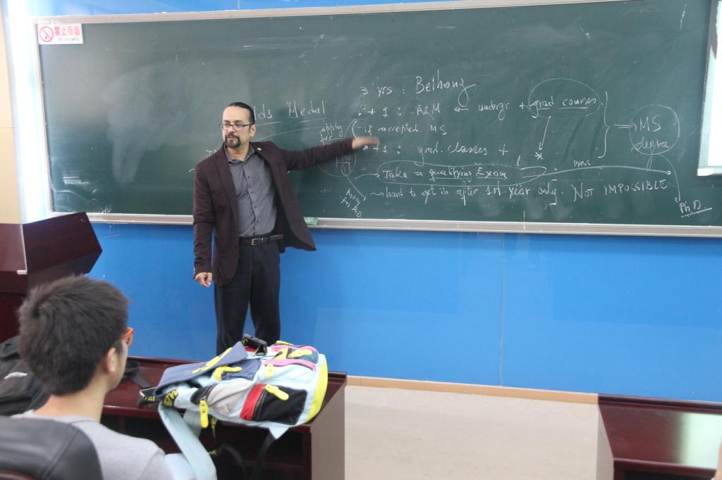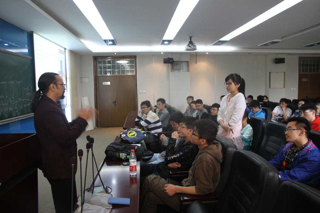 Lima-Filho教授首先向同学们展示了美国德克萨斯A&M大学理学院(TAMU Science Department)近年来的办学及发展概况,并详细介绍了理学院各个数学专业方向的人才培养计划包括各类专业所修的课程清单及未来就业方向。接下来他为大家介绍了“BUAA- TAMU数学专业本科生快车道”这一国际交换项目的具体情况,即在北航数学学院完成前三年的学业后申请去TAMU继续读一年的graduate和undergraduate混合的课程,然后由员工学习情况决定在接下来的一年内读完Master Degree或是直接去攻读PHD。接下来的互动交流环节中,同学们就当前关心的申请问题以及未来规划向Lima-Filho教授踊跃提问,教授清晰亲切的一一作答也解答了同学们心中存在的疑虑。此次座谈会进一步推进了公司与美国德克萨斯A&M大学的沟通,也为2015年华罗庚班的国际交流计划的实施拉开序幕。