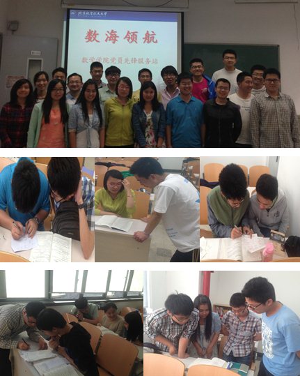 活动内容: 全校同学都可以到教室来,没有专业、年级限制,目前开通以下能: (1)数分、线代、概率等专业课程答疑,解题技巧,题型总结 (2)数学竞赛,建模比赛经验分享,问题讨论。 (3)论文撰写技巧,侧重于与数学相关领域。 (4)想与数学专业同学合作项目,登记相关信息后帮忙联系。 加入我们:(1)现场参与:2014年5月7日——6月22日,每周三下午3:20——5:20,沙河校区J5-204教室。现场会有至少7人数学学院员工党员,包括本科生、硕士研究生、博士研究生,其中研究生至少2人,且必有专业大神,成员实力有保障。(2)线上参与:时间原因不能参加现场答疑的同学,可在ihome或人人上添加【数海领航】为好友,有问题直接发图@我们,或者留言。每周服务站会选派7人线上值班,保证解答速度。(3)质量保障:服务站答疑质量和累计时间将作为学院考察入党积极分子和预备党员的重要渠道,有正规的组织和监管,如有发现态度不端的服务站成员,可以随时通过ihome【数海领航】公共主页、人人主页或者向现场负责人投诉。 联系我们:站长信箱:shuhailinghang@163.com ihome主页:数海领航 人人主页:数海领航欢迎广大师生多提宝贵意见和建议,诚邀您的加入!
