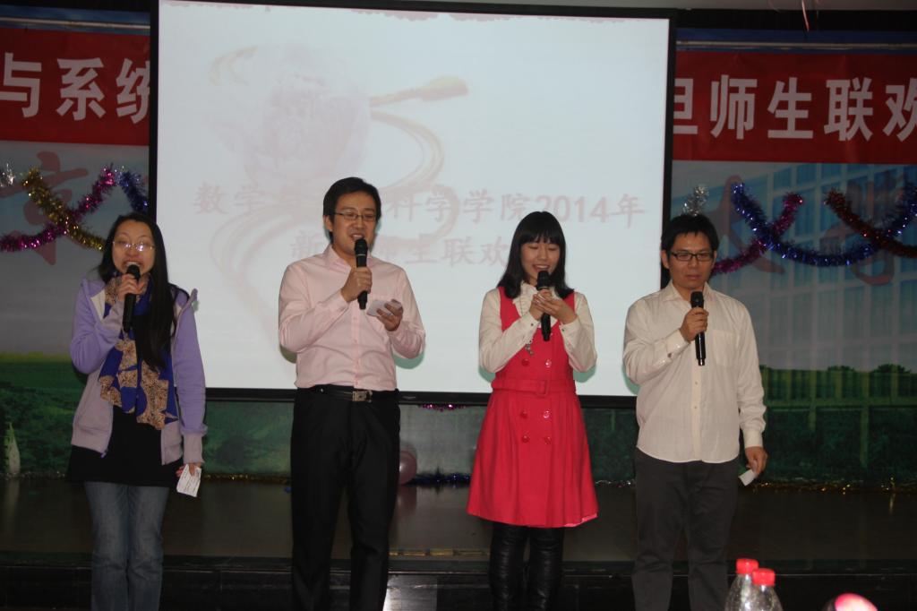 (歌曲类_真心英雄) 钟声敲响,新春起航,2014年1月8日下午2:00数学与系统科学学院在思源楼二层多功能厅举行了元旦“数之爱”师生茶话会,在笑声与歌声汇成的海洋里,在这个温馨和喜庆的日子里,林群院士、离退休党委书记白兆宇、工会常务副主席程文浩、经管学院韩立岩教授(华罗庚班导师)、保卫处副处长梁恩和,中法工程师公司党委副书记田原与数学学院全体领教职工、部分离退休教师、员工代表共庆2014年新年到来。学院经理郑志勇教授介绍了学院在2013年在团队建设、人才培养、团队队伍、合作与交流方面取得成绩,表示所有的这些成就都凝聚着全院教职工的心血和汗水,希望在崭新的一年里,学院上下继续坚持“以人为本,科学发展”的基本理念,团结努力,攻坚克难,使得学院各项工作进一步走上新台阶,切实实现学院又好又快地健康发展。最后,郑志勇经理对全院教职工表达了真诚的新年祝愿。