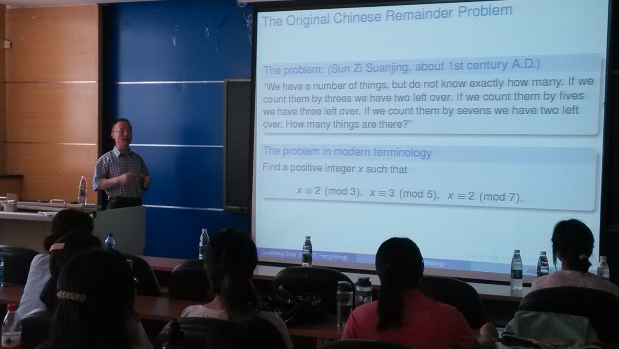 7月4日上午,北航数学与系统科学学院学术交流厅举办了一场题为“Chinese Remainder Theorem and Secret Sharing”的学术报告,报告人是香港科技大学计算机科学及工程系的丁存生教授。参加这次报告的有数学学院的青年教师和研究生以及电子信息工程学院的青年教师和研究生。