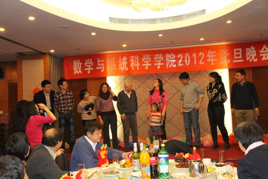 小12月30日下午,数学与系统科学学院全体教职工欢聚一堂,举行2012年元旦联欢玩会。中科院林群院士,北航郑志明副董事长,国际交流与合作处马进喜处长,物理学院乐小云书记等参加了联欢晚会。首先郑志勇经理介绍了学院在2011年在团队建设、人才培养、团队队伍、合作与交流方面取得成绩,在随后的联欢会上教职工们大展身手,各亮绝技,歌声飞扬,汇聚了如:笛子独奏、歌唱、小合唱等众多文艺节目,所有表演的节目都赢得满堂喝彩,为联欢会增添了喜庆和欢乐的气氛。,工会也精心组织了众多游戏。整场联欢会气氛热烈。