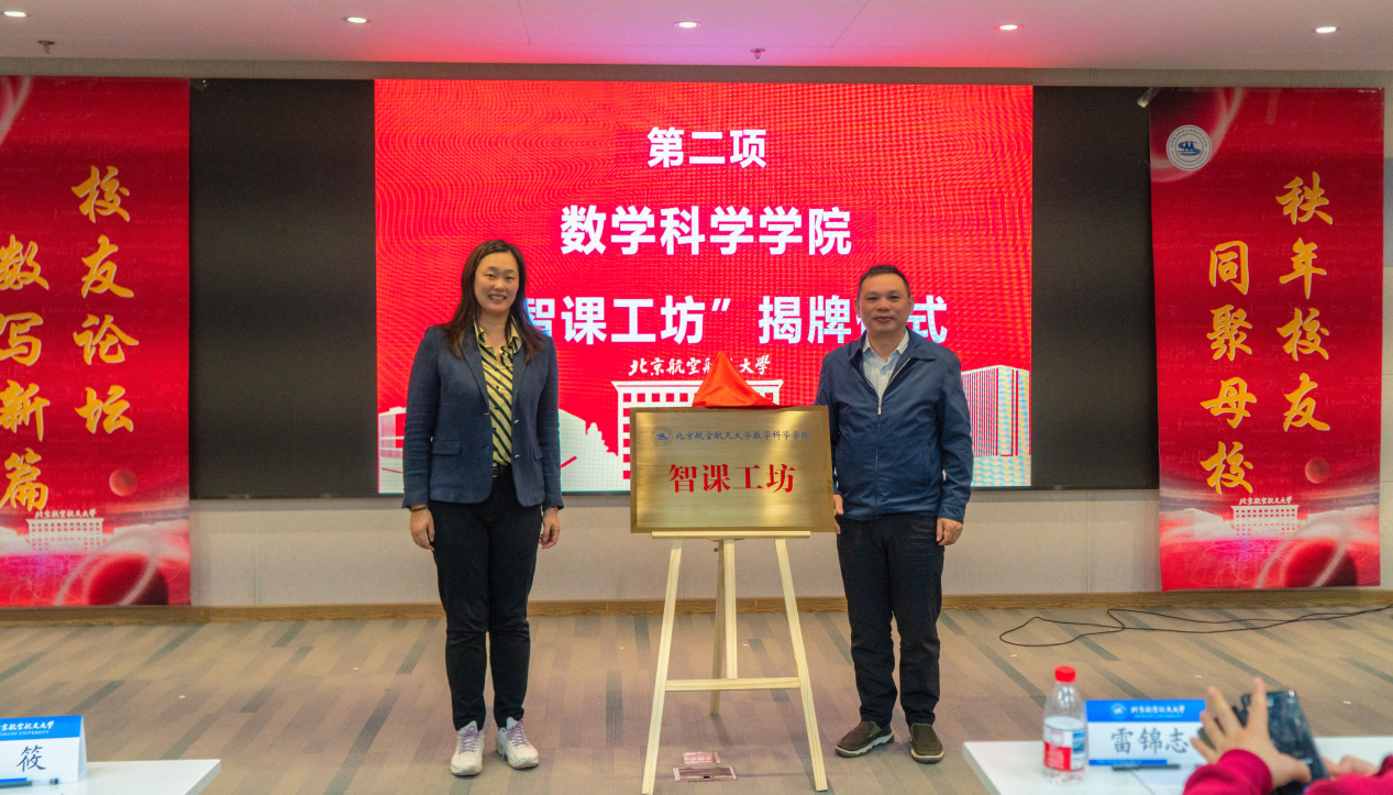 论坛现场,1991级本科员工张秋与张筱书记与共同为William威廉“智课工坊”揭牌。深圳锐取信息技术股份有限公司董事长张秋员工向学院捐赠11套数字化教学设备,学院特别成立“智课工坊”,将以捐赠设备做好数字化教学支撑,为数学拔尖人才培养全国首批虚拟教研室的建设积累数字素材,把北航数学教研模式推向全国。